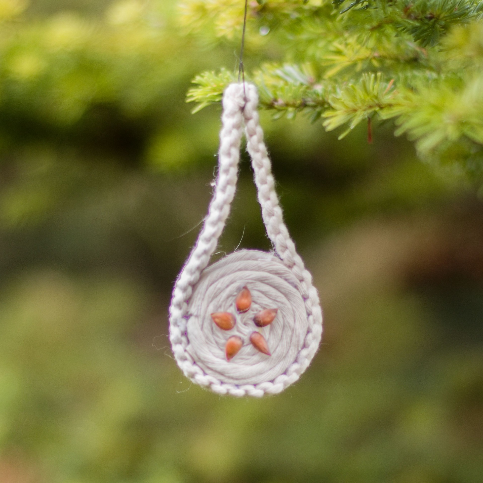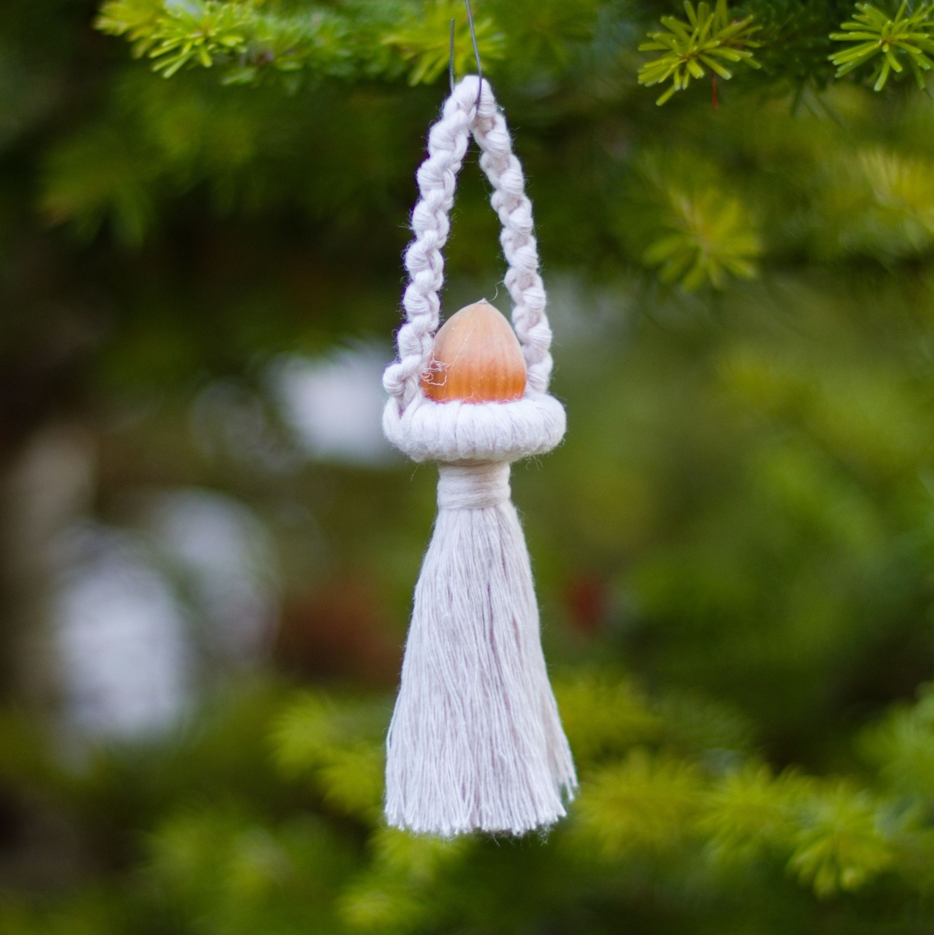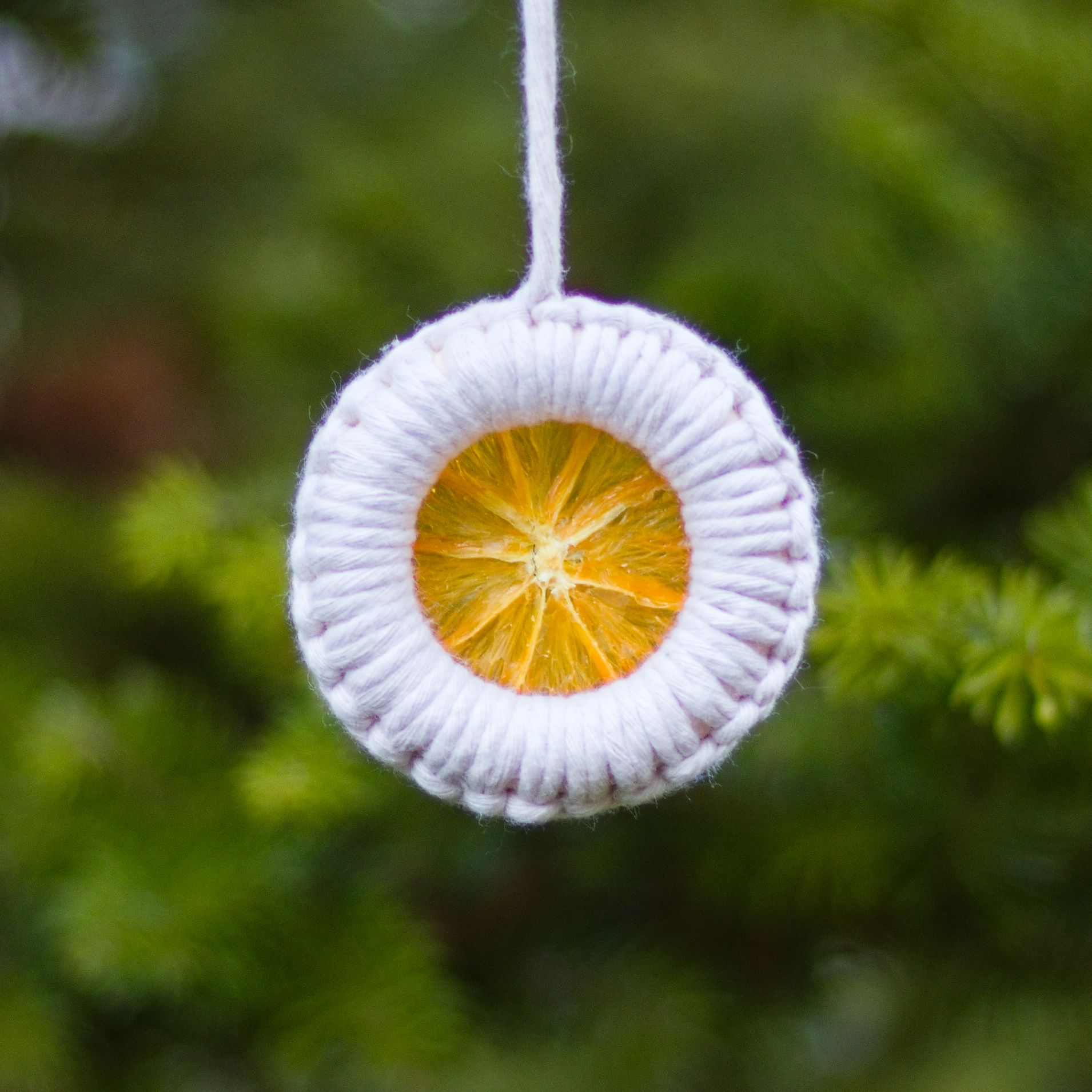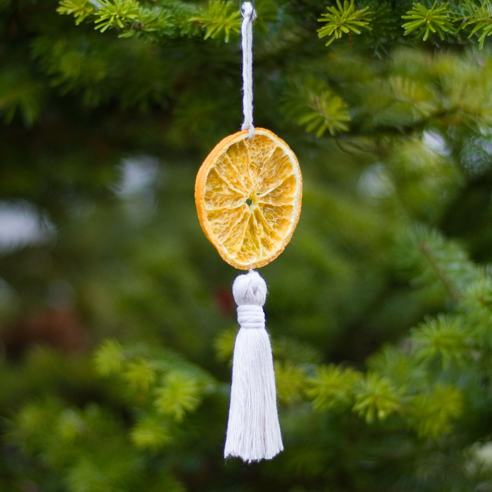 Sada 5 kusů vánoční ozdob zdobených sušenými pomeranči, jablečnými jadérky a lískovými oříšky. Délka jednotlivých ozdob je od 5 do 13 cm bez šňůrky na zavěšení. Barva nitě béžová.